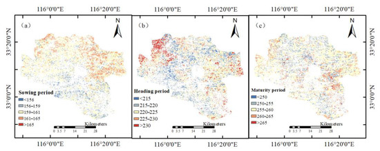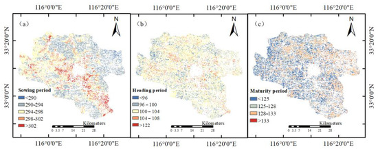 Spatial distribution of maize phenological periods in Lixin County, 2021. (a) Sowing period; (b) Heading period; (c) Maturity period.