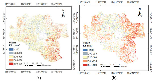 In this paper, the ETseason of wheat and maize were similar, which was caused by abnormal precipitation. As Figure 16 shows, the rainfall in the heading period of maize was above the average of the last five years. In the heading period, maize was sensitive to moisture, and its growth was fast [48]. Therefore, the ETseasn of maize is above the multiyear average.