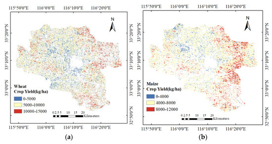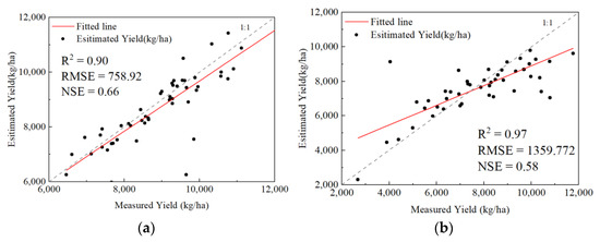 Validation of the estimated crop yield. (a) Winter wheat; (b) Summer maize.