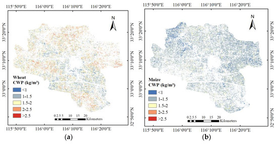 On the basis of Equation (16), crop ET and yield estimated by remote sensing images were used to calculate the CWP. Figure 12 shows the spatial distribution of wheat and maize. The CWP of wheat ranges mainly from 1.0 to 2.0 kg/m3, with an average of 1.6 kg/m3. The regions with low CWP (less than 1.0 kg/m3) are distributed mainly in the center and south. The regions with high CWP (more than 2.0 kg/m3) are distributed mainly in the north. The CWP of maize ranges mainly from 0.9 to 1.5 kg/m3, with an average of 1.39 kg/m3. The regions with CWP less than 1.0 kg/m3 are distributed in the east and north, and there are fewer regions with CWP greater than 2.0 kg/m3.