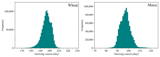 Figure 13 and Figure 14 show the growing season frequency distribution and spatial distribution of wheat and maize. The duration of the wheat growing season ranged mainly from 187 to 206 days, with an average of 197 days. In the western region, the wheat growing season is shorter than that in the northern and southern regions. The spatial distribution of the wheat growing season is opposite of that of the wheat sowing period and is similar to that of the wheat maturity period. The inverse relation indicates that early-sown wheat matured later than others. The duration of the maize growing season ranged mainly from 89 to 106 days, with an average of 97 days. In the northern region, the maize growing season is shorter than that in the southern region. Similar to the relationship among the growing season, sowing period, and maturity period of wheat, earlier-sown maize matured later.
