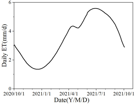 Figure 15 and Figure 16 show the variation in daily ET as well as the comparison between the rainfall and temperature in 2021 and the average of the last five years. Winter wheat and summer maize rotation is the main cropping pattern in Lixin County. The variation in daily ET exhibits an M shape, and the peaks appear at the heading period of wheat and maize. From November 2020 to February 2021, the temperature and daily ET were low. After the period of seedling establishment, the daily ET increases reached the peak value in the heading period of wheat. In the maturity period of wheat and the sowing period of maize, the daily ET was low. In the heading period of maize, the temperature was high, the rainfall was copious, and the daily ET reached the other value peak. In the maturity period of maize, the temperature began to fall, the daily ET also gradually decreased.