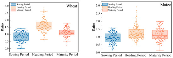 Figure 17 shows the variation in the ratio of actual to potential ET for different phenological periods. The ratios in the heading period were higher than those in the other periods. In the heading and maturity periods of wheat and maize, rainfall was abundant, and the actual ET was high. Especially in the heading period of maize, rainfall was sufficient to meet the needs of crops.