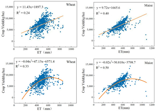 Figure 18 illustrates diagrams between crop yield and ET required to achieve that yield. The linear fitting curves show that the relationship between yield and ET is positive. Compared with the linear fitting method, the polynomial fitting method is better. The polynomial fitting curves show that there is a negative parabolic relationship between the crop yield and ET. The crop yield increases before reaching the peak and then drops as the ET increases. This means that more irrigation does not necessarily result in a higher yield [6]. Therefore, high crop yield, supported by high water supply, will not lead to high CWP.