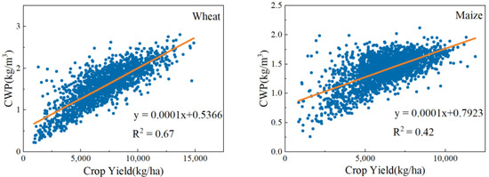 In Figure 19, there is a close linear relationship between CWP and crop yield. The CWP generally increases as crop yield increases. This conclusion is similar to the study results of Li et al. [6]. Therefore, an important direction of CWP development is to improve the yield in Lixin County.