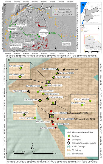 Overview map of the study area. (a) The location of Jordan and surrounding countries (b) The area of Irbid governorate and the study area. (c) Schematic diagram showing the regional water supply system in 2017 (modified after [82]) and (d) The Wadi Al Arab well confinement condition and lithological availability map.