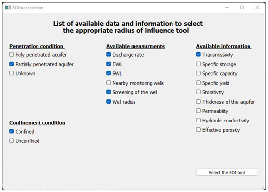 Moreover, aiming to bring science into practice, the research-based tool (RBT) enables users to benefit from the conducted research studies that focus on managing groundwater wells and wellfields. Although many scientific research studies (e.g., [92,93,94]) provide novel methods that are essential for improving wellfield management, it is not always easy for the practitioners to apply such methods as they lack a mathematic and/or programming background and skills. The RBT provides practitioners with a user-friendly graphical user interface (GUI) to select and apply certain methodologies directly to the managed wells, without requiring previous knowledge of mathematics and/or programming. For instance, there are different methods to calculate the radius of influence of a well (ROI). The method selection is based on the conditions in the field and the availability of data and information. Before the user selects a method to calculate the ROI, a list of different parameters and the conditions of the well pops up, and accordingly, the RBT selects the appropriate methods that fit the available data and conditions (Figure 2).