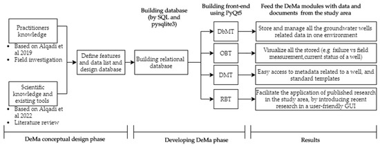 Schematic diagram for the method followed to apply DeMa on the Wadi Al Arab wellfield. Acronym list: database management tool (DbMT), observation-based tool (OBT), documents-based tool (DMT), research-based tool (RBT) [33,91].