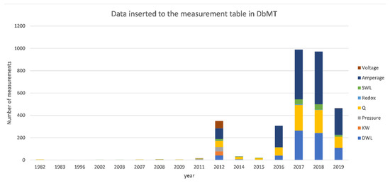 Regarding the field measurements table, the total number of uploaded measurement data is 3187 in the period from 1982 to 2019. However, around 98.4% of these data were collected after 2012 because most of the data collected before 2012 were lost due to the termination of the signed agreement with the Veolia Aqua Company, as mentioned in Section 2 [33]. The economic and scientific loss caused by these missing data is challenging to quantify. Thus, the advantage of a software tool such as DeMa that allows for prompt storage and organization of relevant field data is evident. Figure 4 shows the different types of measurements collected. The amperage shows the highest number of recorded measurements in the graph with a value of more than 1400 records because the alternating current type is three-phase electric power, and actual amperage measurement is collected for all three wires each time. After amperage, the discharge and dynamic water level measurements have the highest collected measurements over time, with a value of around 700 measurements each. Besides the discharge and DWL, the pressure and shaft power should be frequently measured to calculate the pump efficiency and consequently detect possible performance issues [97], predicting failures and planning maintenance accordingly. Therefore, a recommendation that can be given to the wellfield managers by analyzing Figure 4 is to increase the budget and the effort to collect pressure and shaft power data.