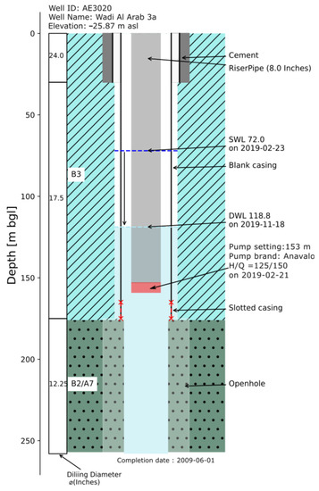 Figure 5 shows the status of AE3020 obtained through the OBT. As observed, the dynamic water level (DWL) gets closer to the pump depth, extending the riser pipe of this well to deepen the pump would be limited to only one segment of the riser pipe (6 m), when taking the pump length into consideration. This is because the pump should not be adjacent to the slotted section of the casing (from 165–175 m, after that open-hole). Otherwise, it will lead to sand pumping, gravel pack damage, and the pump breaking [98]. Another observation can be detected from the figure; it can be seen that the section where the B3 oil-shale aquitard is not cemented, and the casing in the last 10 m of the formation is slotted; such an observation could justify the high concentration of heavy metals in this well [82,87]. Therefore, DeMa brings the numerical and geological information of a well into a graphical representation. This process allows the wellfield manager to better grasp the maintenance needs.