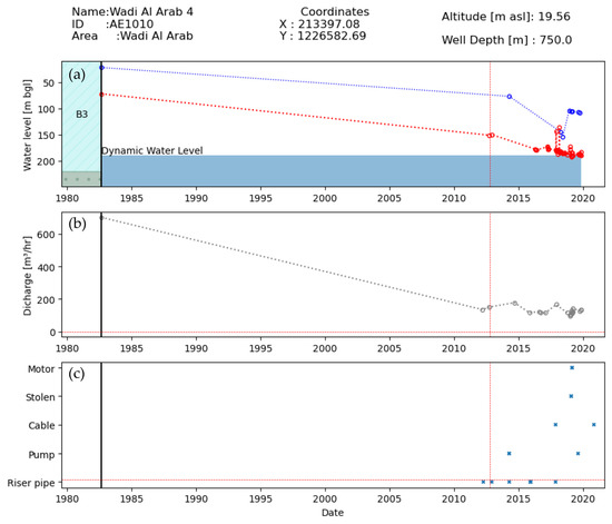 Wadi Al Arab 4 (AE1010) diary graph as part of the OBT. (a) The change in groundwater level (blue dots represent the SWL and red dots represent the DWL) since the drilling of the well, the lithological units of the well, (b) the changes in the discharge (m3/h) over the same period, and (c) the reasons behind interrupting the well’s operation over time. The red cursor is to link the three figures (a–c) visually.