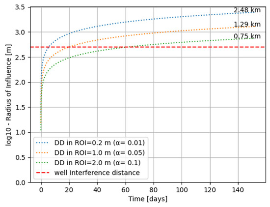 Figure 7 shows that after 152 days of pumping, the ROI of the proposed well is expected to reach 750 m, 1290 m, and 2480 m, where the drawdown at the ROI is 2 m, 1 m, and 0.2 m, respectively. After 60 days of pumping, the drawdown of 2 m would interfere with the Wadi Al Arab 4 ROI; such an observation will assist the wellfield manager in deciding whether the proposed location is suitable. For this hypothetical case, the wellfield manager will propose to shift the well toward the east by at least 250 m or to amend the pumping schedule to avoid significant interference between the ROIs. However, to correctly interpret the results, the assumptions for the application of the proposed analytical solutions mentioned previously should be carefully considered. To achieve better and more accurate results, the specialists could use more sophisticated models that consider the aquifer heterogeneity, geometry, topography, and boundary conditions (e.g., MODFLOW [102] and FEFLOW [103]). However, the provided solutions can be used as a simple-to-use estimate of the ROI.