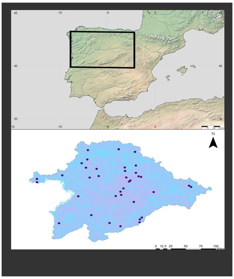 Sampling stations were located in the Duero river basin (NW Spain); it is the largest hydrographic basin on the Iberian Peninsula (98,073 km2, Figure 1). Most of the basin is located under a Mediterranean bioclimate characterized by a strong continentality, with severe winters and relatively warm summers, as well as an endorheic rainfall regime. A network of 80 large dams regulates water flow. Main land uses are agriculture and farming, industrial activities being of less importance. The population density is one of the lowest in Europe (26 inhab·km−2), although aquatic ecosystems have historically suffered intense anthropogenic impacts [14].