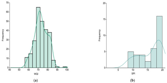 Histogram of WQI (a) and SPI (b) values obtained. Data fitted to a kernel density estimator.