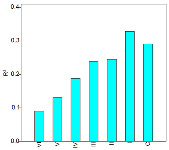 Evolution of the coefficient of determination between WQI and SPI as the water and diatom sampling dates approach, from water samples taken 6 months before diatoms (VI) to the nearest sampling date (C).
