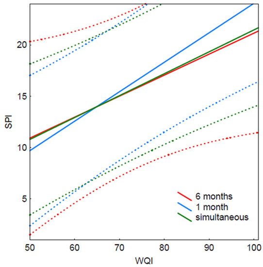 SPI/WQI correlation for water samples taken six months earlier vs. one month earlier vs. simultaneously with respect to diatom sampling. Dots (omitted) fitted to linear regression lines and 95% linear prediction bands.
