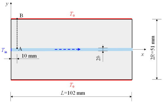 A single horizontal fracture with a constant width was divided into homogeneous and impermeable rectangular rock equally, as shown in Figure 1. The boundary temperature at the model, , was . At and , the boundary was adiabatic. At the inlet (), the fluid velocity was , and the temperature was ; at the outlet (), the fluid velocity was free. It was assumed that: (1) heat conduction was only in the direction perpendicular to the fracture surface; (2) the thermophysical properties of water and rock were constant; and (3) the fracture was simplified as a porous medium with an infinite void ratio, i.e., the void ratio was 100. The parameters used in the numerical simulation are listed in Table 1.