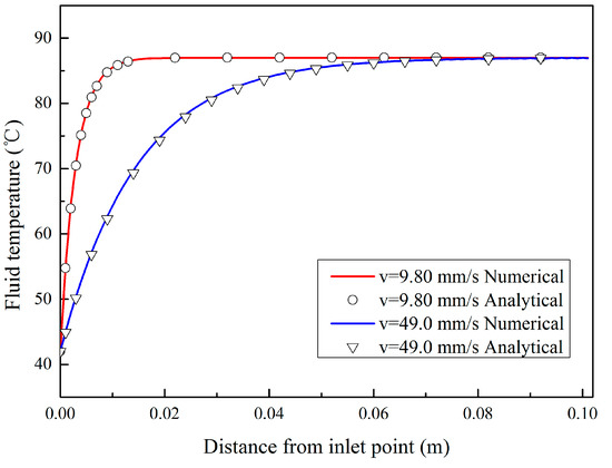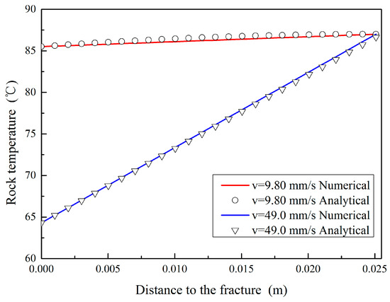The temperatures of fluids with different flow velocities in the fracture along the flow direction and the temperature of the rock matrix along the line AB were consistent with the analytical solutions, as shown in Figure 2 and Figure 3. This shows that the numerical solution was consistent with the analytical solution.