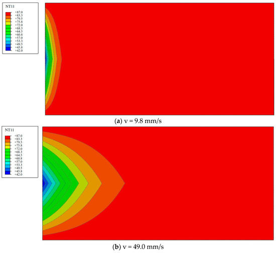 Diagram of temperature field distribution under different velocities of flow (unit: °C).