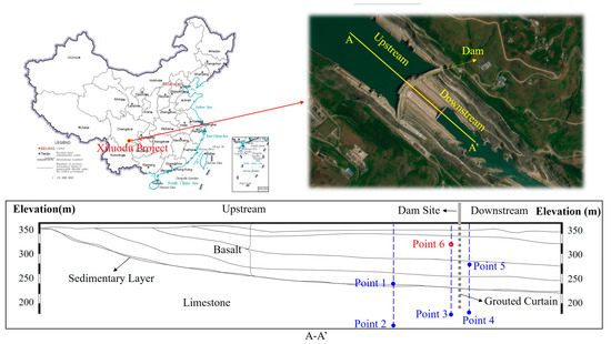 The valley-narrowing deformation at the Xiluodu Project has reached approximately 90 mm. The monitored valley-narrowing deformation of the Xiluodu arch dam project during initial impoundment is more serious than the other projects. Some researchers have studied the influence of temperature on the valley-narrowing deformation of the Xiluodu arch dam project [1,2] and agree that the cooling shrinkage of the bedrock in the dam upstream can cause the valley-narrowing deformation. However, the dominant mechanism of the cooling shrinkage of the bedrock is still under debate. When the reservoir starts to impound, the lower-temperature reservoir water has a cooling effect on the rock of the submerged area, and the seepage of the cold water causes heat migration, resulting in changes in the temperature fields of the reservoir bank and bedrock. When the pore pressure and temperature gradients exist in the pore medium, the pore flow has heat exchange with the solid skeleton, which leads to the redistribution of temperature, seepage, and stress fields. This phenomenon is known as the “Dufour flow” and is widely used in shallow geothermal systems [3], enhanced geothermal systems (EGS) [4], and water conservancy projects [5].