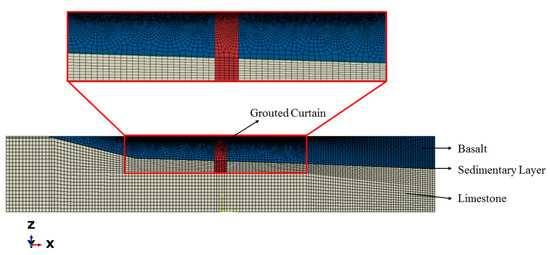 Based on the hydrogeological profiles of the Xiluodu dam site along the direction of river flow (Figure 5), a finite element numerical analysis model of the bedrock profile was established (Figure 6). The number of nodes was 40,770, and the number of elements was 19,809. The confined water level of Yangxin limestone is 2–3 m higher than that of the Jinsha River, and the water head of the confined layer is well synchronized with the river water level. The hydraulic gradient in the vertical river flow direction at the profile is not large [13]; therefore, the heat transfer and water transport in the vertical river direction were not considered.