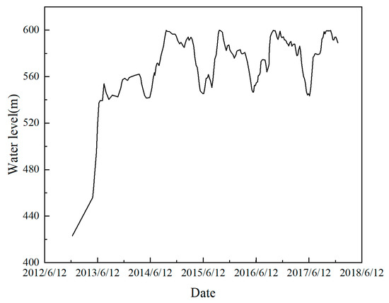 For the Xiluodu reservoir, the natural water level is 370 m, and the hydraulic gradient is 1/1000. The process of the upstream reservoir water level within 5 years after impoundment is shown in Figure 7, and the downstream water level was kept at 370 m. According to geothermal and hydrogeological conditions [1,2], the bottom temperature of the bedrock was set at 41.5 °C. According to the monitoring data [18,19], the periodical water temperature near the depth of 20 m in the Xiluodu reservoir was 15~24 °C from November 2016 to September 2017. After impoundment, the water temperature in the deep-water layer at the bottom of the valley was constantly 15 °C. Therefore, in the simulation, the surface water temperature of the bedrock was taken as 24 °C before impoundment, and the upstream and downstream bedrock surface water temperatures were taken as 15 °C and 24 °C during impoundment. The material parameters [5,20] are listed in Table 2.