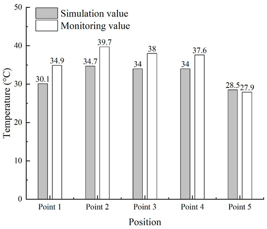The temperature field of the bedrock before impoundment is shown in Figure 8. The calculated and monitored temperature values of the bedrock before impoundment for different monitoring points are shown in Figure 9.