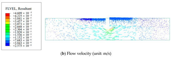 The distribution of pore water pressure and the flow velocity field at a water level of 600 m are shown in Figure 10. Due to the existence of the grouted curtain, the reservoir water mainly flows in the limestone confined layer. Then, the reservoir water flows downstream, and the limestone-pressurized water flows upward through the sedimentary layer into the basalt layer and sinks into the river.