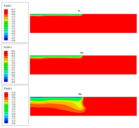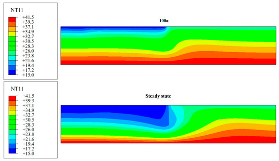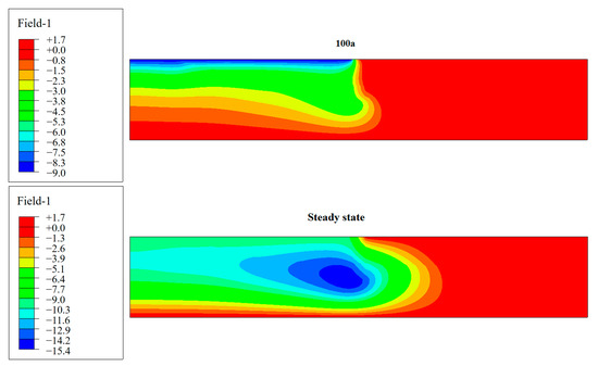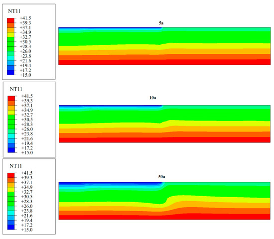 During the 5–10 years of the initial impoundment, the temperature drop mainly occurred on the bedrock surface. The temperature drop range was about 50 m, and it dropped by 9 °C. The bedrock temperature gradually decreased with depth, but the bedrock temperature below the 50 m depth was almost unchanged. When the water was impounded for 50 years, from the surface to a depth of 100 m, the temperature decreased by 9 to 2 °C. At a depth range of 100 m to 200 m, the temperature was reduced by 2 °C. The temperature reduction below a 200 m depth was less than 2 °C. When the water was impounded for 100 years, from the surface to the depth of 100 m, the temperature decrement ranged from 9 to 4 °C. From 100 m to 200 m in depth, the temperature reduced by 4 °C. The temperature reduction below a 200 m depth was less than 4 °C. Comparing the distribution of the temperature field, after the temperature field of the foundation was stabilized, the temperature drop amplitude was 15 °C. It appeared at a depth of about 200 m in front of the grouted curtain. Comparing the distributions of the stable temperature field, the temperature field of the bedrock after 100 years is still far from the stable state. The temperature reduction process is much longer than 100 years.