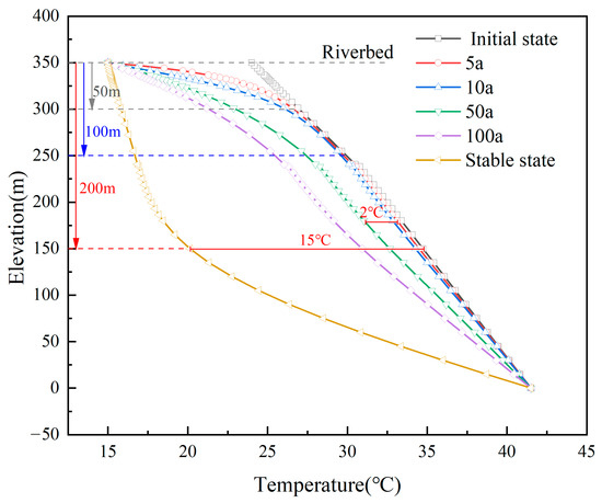 As mentioned above, when the permeability coefficient increased by 20 times and the depth of the bedrock increased from 100 m to 200 m, the temperature decrease range was 6.2 °C, which is far less than 15 °C (Figure 16). Overall, the temperature field is dynamic, which is manifested as the gradual development of the temperature drop from the shallow layer of the bedrock to the deep layer after impoundment. The surface temperature drop occurs in the bedrock with limited impoundment time or low permeability. The deep temperature drop occurs when the impoundment time is long enough or the temperature field tends to be stable in bedrock with high permeability.