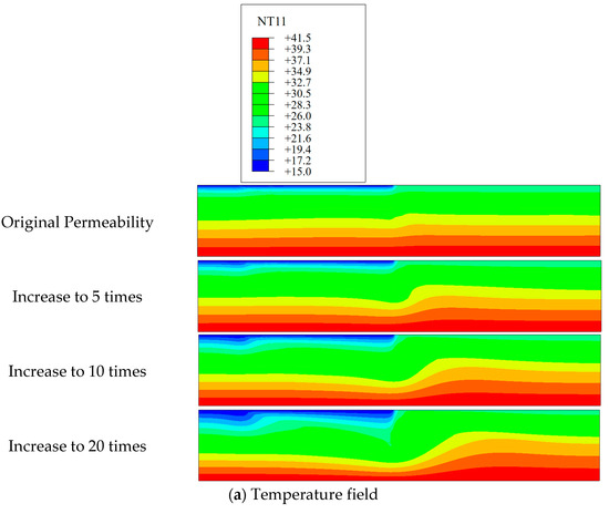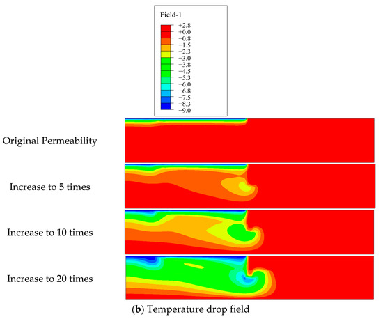 The actual rock mass contains fractures, and the permeability coefficient of the fractures is much larger than that of the complete rock. The equivalent continuum model is usually used to simulate fractured rock, and the fracture network is equivalent by adjusting the permeability coefficient. The velocity of the pore water is sensitive to the permeability of the bedrock, and the pore water flow causes heat transfer, which in turn causes the redistribution of the rock temperature field. The distribution of the temperature field and temperature drop field after 10 years of reservoir impoundment with different permeability coefficients is shown in Figure 14. With an increase in the permeability coefficient, the temperature drop range of the bedrock surface increased, and the effect of upstream cold water infiltration bypassing the grout curtain leading to temperature drop gradually became obvious as well. Finally, it formed a large temperature drop area in front of the grouted curtain deep in the bedrock.