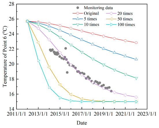 By increasing the bedrock permeability to 5 times, 10 times, 20 times, 50 times, and 100 times the initial permeability, the temperature at Point 6 (as shown in Figure 5) in bedrock with different permeabilities varied with the water storage date, as shown in Figure 15. When the permeability of the bedrock increased to 20 times, the calculated temperature at Point 6 agreed with the monitored value. This phenomenon indicates that the temperature distribution of the bedrock is sensitive to the permeability of the bedrock.