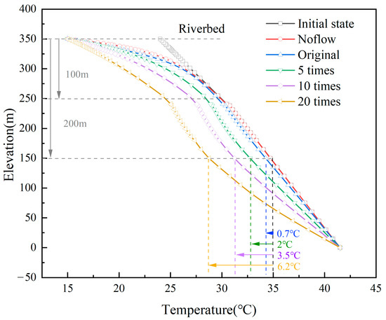 The bedrock temperature at different depths in front of the grouted curtain when the reservoir was impounded for 10 years is reported in Figure 16. Without considering the fracture permeability or the Dufour flow of pore water, the temperature drop mainly occurred on the bedrock surface. The temperature drop range was about 50 m from the bedrock surface, and the maximum temperature decrement was 9 °C. With the increase in depth, the temperature decreased gradually. The temperature of the bedrock below the depth of 50 m was almost unchanged. In cases with 1 time, 5 times, 10 times, and 20 times the original permeability coefficient, the temperature decreased by 0.7 °C, 2 °C, 3.5 °C, and 6.2 °C from a depth of 100 m to 200 m, respectively. These results indicate that the increase in the permeability coefficient has a great influence on the temperature drop in the range of 50~200 m in depth during the 10 years of reservoir impoundment. It should be noted that when the permeability coefficient increased by 20 times and the depth of the bedrock increased from 100 m to 200 m, the temperature decrease range was 6.2 °C, which agrees with the real situation.