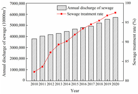 Annual sewage discharge and sewage treatment rate in China, 2010–2020.