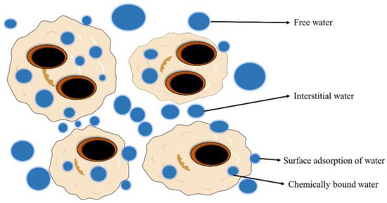 The composition and properties of sludge largely depend on the quality of the water treated in the treatment plant and can generally be divided into two types: municipal sludge and industrial sludge. Municipal sludge is the sludge produced by domestic sewage treatment plants, which has a higher organic content and a relatively low content of toxic and harmful substances such as heavy metals and persistent toxic and harmful organic substances compared to industrial sludge [14]. The classification of municipal sludge is shown in Table 2, which is divided into primary sludge (96–98% water content), residual sludge (99% water content), thickened sludge (95–97% water content), and digested sludge (95% water content), depending on the mud source. The sludge consists of sludge flakes and water; the composition of the sludge flakes is shown in Figure 2. The sludge flocs are mainly composed of microorganisms, including protozoa, filamentous bacteria, microcolonies, organic fibers, inorganic particles, and extracellular polymeric substances (EPS). The water in the mud is distributed in four forms, as shown in Figure 3: bound water, interstitial water, surface adsorbed water, and chemically bound water. Research manuscripts reporting large data sets deposited in a publicly accessible database should indicate where the data is deposited and provide the appropriate accession numbers. If accession numbers are not available at the time of submission, please indicate that they will be provided during review. They must be provided prior to publication [15].