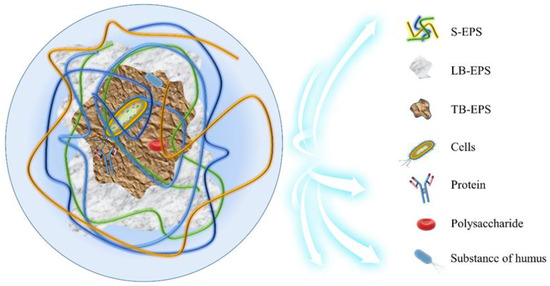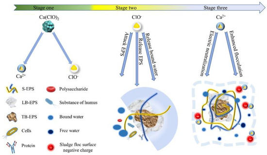 EPS is a product of cell division and macromolecular hydrolysis that contains adsorbed material from the wastewater treatment process. EPS is generally distributed outside the cells as well as wrapped around the microbial matrix of the sludge. It accounts for about 80% of the total sludge and 50–60% of the organic matter content in the sludge. The mud EPS components include proteins, polysaccharides, humic acids, and nucleic acids. Based on the spatial distribution properties and compactness of EPS, as shown in Figure 4, EPS can be divided into dissolved EPS (S-EPS), loosely bound EPS (LB-EPS), and tightly bound EPS (TB-EPS) from the outside in. The amount of sludge EPS is negatively correlated with sludge dewatering performance, and the amount of protein and humic matter affects the amount of negative charge carried on the surface of the sludge floc, which in turn affects the dewatering performance of the sludge. Ge et al. [21] developed the PFS/O3 process as a novel environmentally friendly method to break down sludge flocs and EPS to improve dewatering performance. Deep dewatering of the sludge is easily accomplished when the optimal dosage levels of PFA and O3 are 40 mg/g TS and 60 mg/g TS, respectively. The results of the PFS/O3 sludge treatment showed that the percentage of dead cells in the sludge was 47.3%, indicating that the microbial cells suffered greatly and that the proteins and polysaccharides in EPS were released through hydrophobic channels, to improve the dewatering performance of the sludge. The interaction between the EPS and the sludge cells had a significant impact on the coagulability of the microorganisms. The coagulation mechanism of cationic coagulants is based on adsorption bridges and two-electron layer compression, and ionic bridges between multivalent cations (including Ca2+ and Mg2+) and EPS are also considered as a key factor in sludge flocculation. Chen et al. [22] studied a hydrothermal process in combination with FeSO4-7H2O/Ca(ClO)2 for sludge conditioning to improve sludge dewatering performance. The results showed that the surface water content of the mud decreased and the free water content increased significantly under the hydrothermal method and FeSO4/Ca(ClO)2, indicating that the EPS in the mud was degraded and part of the water was absorbed in the EPS was published.