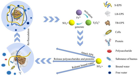 The advanced oxidation technology of activated persulfate uses SO4− as the main reactive group and is divided into two types, peroxomonosulfates and peroxodisulfates, which are generally referred to as peroxodisulfates. As shown in Figure 8, activated persulfates are activated by light, heat, and transition metal ions, and the persulfate ion S2O82− is activated and decomposed into SO4−, destroying the specific functional groups of the fluorescent material, resulting in polymer chain breakage and damage the sludge cells, leading to the release of bound water, intracellular material, and intracellular water from the EPS, enhancing the dewatering performance of the sludge. The most commonly used activation method is Fe2+ activation, with a standard redox potential of 3.1 V for SO4−, which exceeds that of the strongly oxidizing –OH and is more stable to oxidizing pollutants, making it more suitable for a wider range of applications. Guo et al. [34] uses Fe2+ activated potassium persulfate (PPS) for sludge treatment. The results showed that the Fe2+-activated PPS improved the dewatering performance of the sludge with a lower PPS dosage and a shorter treatment time. When PPS and Fe2+ were dosed at 0.5 mmol/g and 1.0 mmol/g, respectively, the CST decreased sharply within 15 min and finally fell to only 25.1 s; SRF decreased to 1.75 × 108 m/kg.