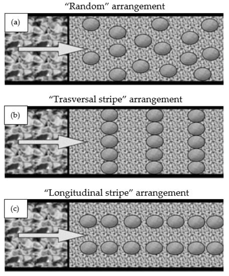 Planimetric view of “Random” (a), “Transversal stripe” (b), and “Longitudinal stripe” (c) arrangements investigated by Canovaro et al. [].