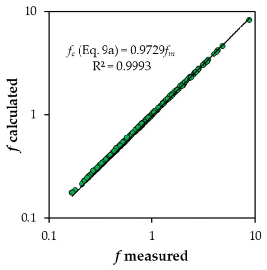 Comparison between the f values and those calculated applying Equation (9a), obtained for the “Random” arrangement by Canovaro et al. [], to the dataset by Ferro and Giordano [].