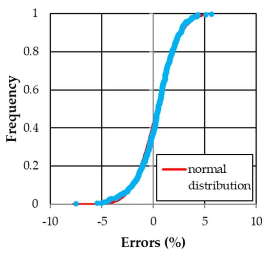The friction factor values calculated applying Equation (9a) to this dataset are characterized by errors in estimate E, which are distributed according to the normal law (Figure 4), less than or equal to ±5% for 98.8% of cases and less than or equal to ±2.5% for 82.4% of cases.