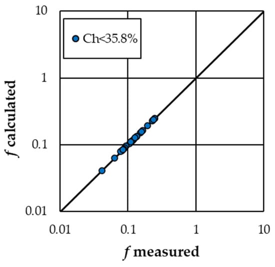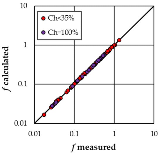 Equation (9a) was tested using the 416 experimental data by Ferro and Giordano [], since these data were obtained for an overlapped range of element concentrations (0 ≤ Ch ≤ 44%). Figure 3 shows the comparison between the measured f values and those calculated applying Equation (9a), obtained for the “Random” arrangement by Canovaro et al. [], to the dataset by Ferro and Giordano []. For the dataset by Ferro and Giordano [], this figure shows that, on average, the Darcy–Weisbach friction factor values calculated by Equation (9a) are approximately equal to 0.97 fm. In other words, Equation (9a) systematically underestimates (−3%) the f values measured by Ferro and Giordano [].