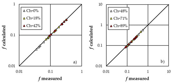 The same procedure was applied for the data with Ch ≥ 48%, and the mean values of b (1.1175) and c (0.587) coefficients were used obtaining a coefficient equal to 0.3356 for the “Random” arrangement, and 0.3366 for the “Transversal stripe” arrangement (Table 2). Figure 9 shows the comparison between the f measured values and those calculated coupling Equations (4) and (7) with b = 1.1175, c = 0.587 and a varying with the arrangement. In this case, the errors E in the estimate of the Darcy–Weisbach friction factor are always less than or equal to ±5% and less than or equal to ±2.5% for 86.4% of cases.