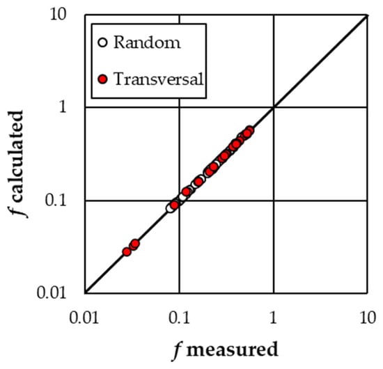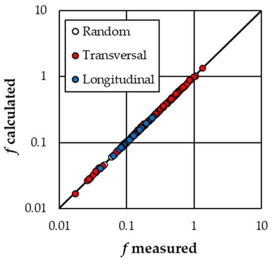 Comparison between the measured f values and those calculated by Equation (13) for the “Longitudinal stripe” arrangement.