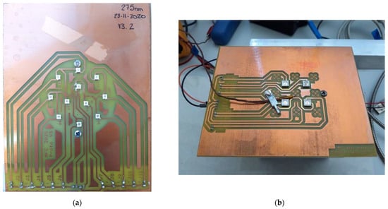 Two types of printed circuit boards (PCBs) were designed and manufactured at the University laboratories: low-power UV-LEDs boards containing 11 LEDs each in a circular shape to match the Petri dish geometry and medium-power UV-LED boards with 4 LEDs in a square-shape arrangement as shown in Figure 1. The first three boards were designed using Orcad PCB designer software and manufactured by the chemical method. The last board was designed using EasyEDA PCB designer and manufactured in a PCB factory in China (JLCPCB). The LEDs were soldered to the boards using a reflow PCB oven from Hangzhou NeoDen Technology “NeoDen IN6”. Finally, each board was attached to a heat sink with an active thermal dissipation via a fan, and thermal paste was used in the board –heat sink interface.
