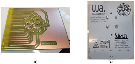 Example of PCB boards for the two powers used in the study: (a) low-power (1.6 mW) UV-LEDs @ 275 nm, (b) medium-power (50 mW) UV-LEDs @275 nm, (c) low-power (1.6 mW) UV-LEDs @ 265 nm, and (d) medium-power (50 mW) UV-LEDs @ 265 nm.