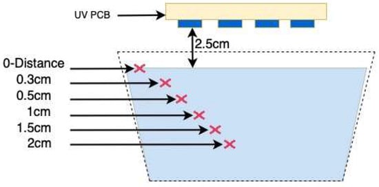 Irradiance was measured with an ILT 2400 radiometer from International Light using the ILT-SUD005-10/U SUD detector. For measuring the transmittance of the UV light emitted from the LEDs through the water, the underwater version of the UV irradiance detector was used (SED005/WBS320/WU). The detector was placed under water at various depths to measure the loss of irradiance from 0 cm to 2 cm (Figure 2). Milli-Q water with 0 NTU was initially used, followed by the effluent of the wastewater plant, with some degree of turbidity.
