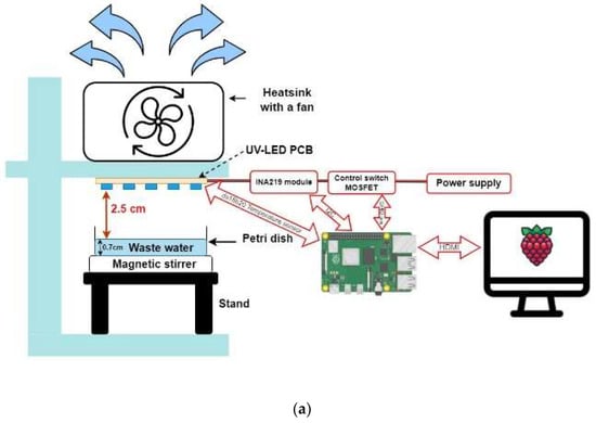 Figure 3 shows the experimental setup. The 55 mm diameter Petri dish with 15 mL of wastewater was placed under the UV-LEDs board at a distance of 25 mm. A small stirrer of 2.5 mm × 2.5 mm was used to ensure homogeneous illumination. The PCBs were mounted on a stand using an aluminium bar to adjust their height over the water samples and attached to a heat sink with a fan for heat dissipation.