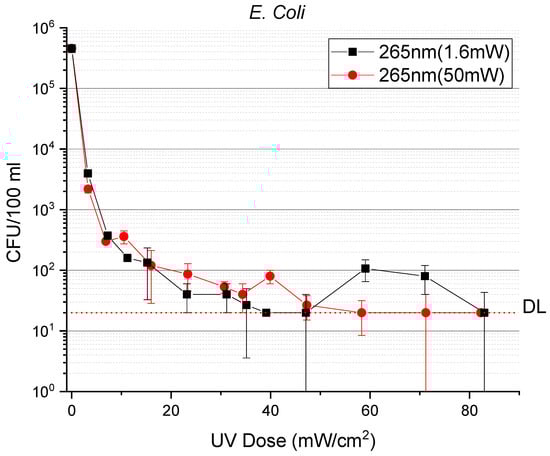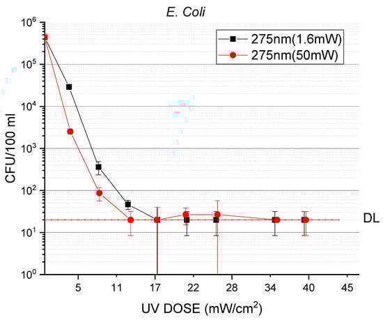 For E. coli, the detection limit (DL: 1 CFU/ 5 mL or 20 CFU/100 mL) is reached between 39 mJ/cm2 and 58 mJ/cm2 for the two optical power LEDs, showing some tailing after as fluctuation is produced by detection of about 0–1 colonies per plate. In terms of time, the 50 mW LED had to be used for 34 s to accumulate a UV dose of 58 mJ/cm2, whereas, for the 2.5 mW LED, 150 s were required for the same UV dose. This means less usage of the 50 mW LED and, therefore, higher water disinfection and LED lifetime.
