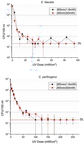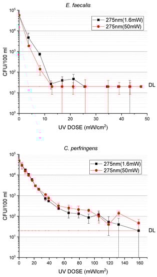 UV-LED disinfection results for E. coli, E. faecalis, and C. perfringens at 275 nm under two different optical power UV-LEDs (1.6 mW and 50 mW) maintaining the same UV dose. DL—Detection limit.