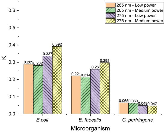 Lower inactivation rates belong to Clostridium perfringens, with values around 0.063–0.065 cm2/mJ for 265 nm and 0.047–0.049 cm2/mJ for 275 nm. The turbidity level for the 275 nm experiments was higher, 10 NTU vs. 4.9 NTU for the 265 nm, so lower inactivation rates for the 275 nm wavelength could be due to this fact as previous experiments under similar turbidity values showed only slightly better performance of the 265 nm UV wavelength.